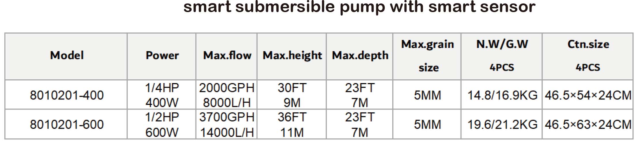 - Submersible water pump with smart sensor for automatic operation – detects water and starts